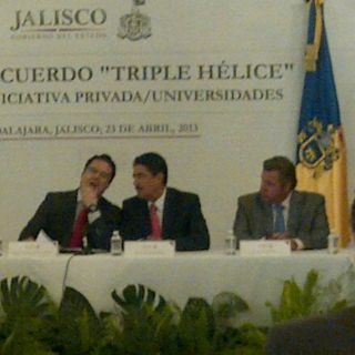 GUADALAJARA, JALISCO (23/ABR/2013).- En la misma mesa coincidieron autoridades estatales, líderes de grupos empresariales y representantes universitarios. El motivo fue firmar en Casa Jalisco el acuerdo "Vinculación productiva triple hélice".