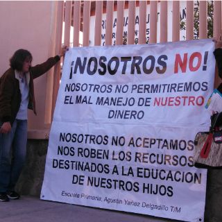 Este viernes por la mañana, a la hora de entrada, algunas madres trataron de persuadir a más padres, invitándolos a firmar la queja y mostrándoles una manta en la que expresaron estar inconformen con la forma en que se ha manejado su dinero.