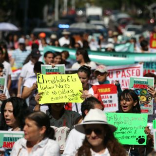 ''¡Basta ya del maltrato animal! ¡Toros sí, toreros no". Entonaron constantemente durante su trayecto los integrantes de la marcha, quienes portaban pancartas de rechazo al maltrato animal.