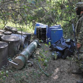 La Marina refirió el jueves que en el lugar donde se encontró el laboratorio había 12 tanques de gas, 35 bultos de sosa cáustica, nueve bultos de acetato de sodio, toneles de plástico y bidones, quemadores, entre otras cosas.