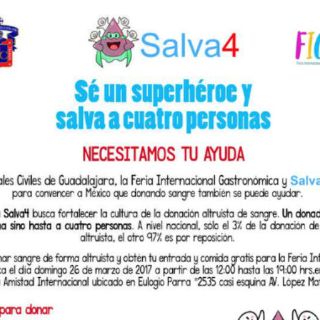 Esta iniciativa de reciente creación cuenta con el apoyo de los Hospitales Civiles de Guadalajara y el del Cuerpo Consular de Jalisco quienes están listos para dar un paso más allá en busca de las donaciones, teniendo como marco la Feria Internacional Gastronómica (FIGA) que organizan en la ciudad. Salva4, el Cuerpo Consular Jalisco y los Hospitales Civiles trabajan en conjunto; todas las personas que acudan a donar sangre de forma altruista, a cualquier hospital civil de Guadalajara, podrán ingresar a la feria con su comprobante de donación y ahí recibirán un vale para comida, que podrán canjear en cualquiera de los más de 40 puestos de alimentos en el lugar.