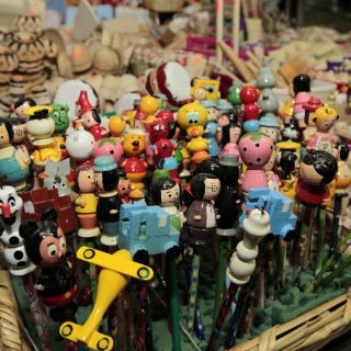 El balero es un juguete formado por un cilindro de madera y un mango que encaja en uno de sus lados. Ambos están unidos por un cordón.