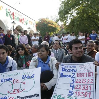 GUADALAJARA, JALISCO (12/OCT/2010).- Estudiantes y profesores del Centro Universitario de Ciencias Exactas e Ingenierías (CUCEI) de la Universidad de Guadalajara (UdeG), recibieron la mañana de ayer clases de Matemáticas y de Medio Ambiente a las afueras de Casa Jalisco, que marcaron el inicio del cambio de estrategia de la UdeG para exigir al Gobierno del Estado que entregue los 701 millones de pesos (MDP) de contrapartidas federales pendientes desde hace tres años, y los 390 MDP de ampliación presupuestal.
