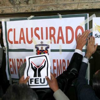 Ahí, una comitiva liderada por López González cerró simbólicamente el acceso al recinto al colocar en sus puertas una serie de calcomanías con las leyendas "clausurado" y "en proceso de embargo", rodeados de otras imágenes con emblemas de gremios universitarios.