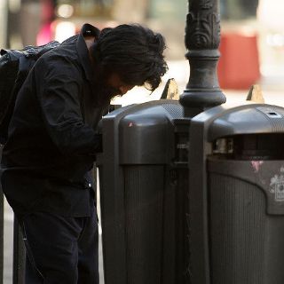 Por las mañanas emprende una odisea que dura horas. Come cualquier alimento que encuentra en los botes de basura, los líquidos es lo que más abunda, y siempre lleva consigo dos o tres botellas de agua natural y de sabor en la mano. Sólo detiene la búsqueda por unas horas, porque se sienta a esperar a que la noche caiga para continuar indagando lo que se acumula en los depósitos.