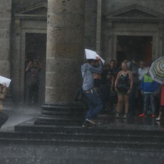 GUADALAJARA, JALISCO (11/AGO/2016).- Una fuerte lluvia que comenzó alrededor de las 13:00 horas sorprendió a los paseantes del Centro Histórico de Guadalajara.