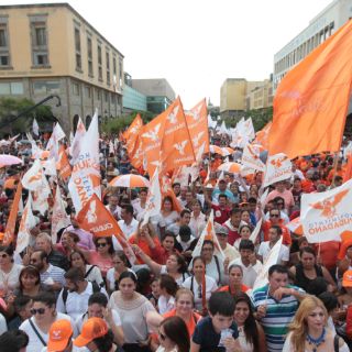 Simpatizantes del partido Movimiento Ciudadano (MC) arribaron al mitin político en la explanada del Instituto Cultural Cabañas, a bordo de camiones urbanos y privados. Ante ello, los dirigentes naranjas fueron acusados de “acarreo”.