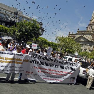 Maestros de la Unión Nacional de Trabajadores (UNT) iniciaron su caminata rumbo al Centro tapatío para hacer su pronunciamiento sobre su realidad laboral, en el marco del Día del Trabajo.