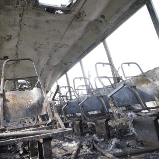 La siguiente orden fue que abriera las puertas y descendiera junto con todos los ocupantes de la unidad. El sujeto que lo apuntaba con la pistola "se baja atrás de nosotros y nos grita que no volteemos hacia atrás. Ya cuando volteamos se habían quedado arriba los otros dos acompañantes, son los que le prenden fuego al camión. Al momento que avientan lo que traían en las bolsas (desconoce el contenido), se bajan y corren en dirección hacia Chapala, unos metros adelante estaba una camioneta blanca esperándolos, se subieron y se fueron", recuerda.