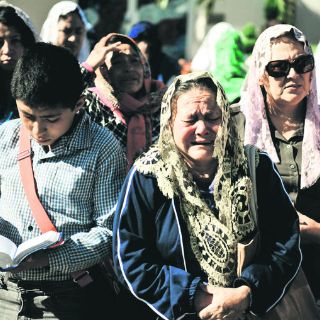 GUADALAJARA, JALISCO (09/DIC/2014).- En la calle Belén, en la Hermosa Provincia, una mujer lloró la muerte de Samuel Joaquín Flores, líder de la Iglesia de la Luz del Mundo. Lo hizo sobre la banqueta, hincada, sollozando, apoyando las manos en el suelo caliente, cubriéndose la cara y el cabello con un trozo de encaje. Las lágrimas, abundantes, cayeron al piso, que se las sorbió.