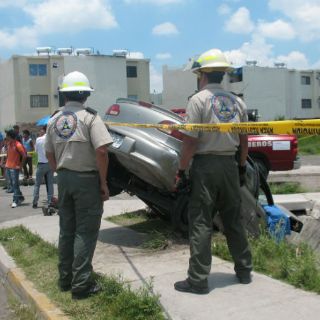 quedó incrustado dentro de un canal de aguas pluviales, en el fraccionamiento Lomas del Mirado, tras un accidente vial en el que el chofer falleció, mientras que el copiloto fue llevado a un hospital.