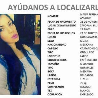 María Fernanda tiene cabello castaño oscuro ondulado y largo, ojos café oscuro, mide 1.75 metros y pesa 70 kilos, su tez es blanca, y como señas particulares llevaba un vestido negro y calzaba botines de tacón a la hora de su desaparición.