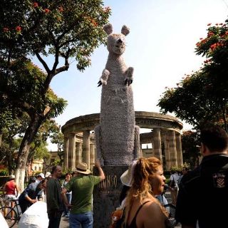GUADALAJARA, JALISCO (20/NOV/2011).- Con la advertencia de que se trata de "Un ilustre monumento, a un rotundo corrupto: Alonso Godoy Pelayo", el grupo Redes Ciudadanas develó una escultura dedicado al auditor del Estado representado por una rata que fue colocada sobre una base de cantera y su nombre al fiel estilo de la tipografía de las efigies de los personajes cuyos restos guarda el monumento que se encuentra en el corazón de la ciudad.