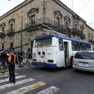 Las unidades obtruyen un carril de la calle Pino Suárez y en distintos tramos, debido a que se reventó la línea de energía eléctrica que alimenta el sistema de transporte