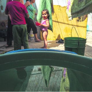 Llenó los recipientes que tiene: dos cubetas y una tina de plástico, que es el más grande de los contenedores y cuya capacidad es de aproximadamente 30 litros. “No vamos a lavar los trastes”, dice Rosa Elena, mientras le pone unos pantalones a Faby, la más pequeña de la familia.