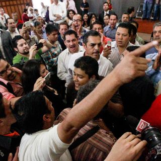 Alrededor del mediodía de ayer, un grupo de unos 80 manifestantes entró al Ayuntamiento e ingresó al salón del Pleno tras patear la puerta, lo que obligó a Enrique Alfaro y a los regidores de oposición a resguardarse en las oficinas de esta fracción.