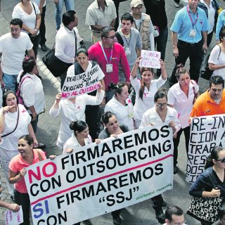 Arribaron unos 300 y poco a poco se fueron agregando al contingente más empleados eventuales del Seguro Popular, quienes se manifestaron para demostrar su inconformidad ante la decisión, que califican como arbitraria, de que sea una empresa outsourcing la que los contrate, y no el programa federal, como se hacía hasta el pasado 30 de junio, cuando se venció su último contrato.