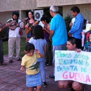 Un grupo de jóvenes con guitarra en mano, cantaron en contra de la violencia, además había niños que sostenían carteles con la leyenda: "Paz en Gaza. Basta al Genocidio", sus manos cubiertas con tinta roja, con la que aparentaban estar llenos de sangre.