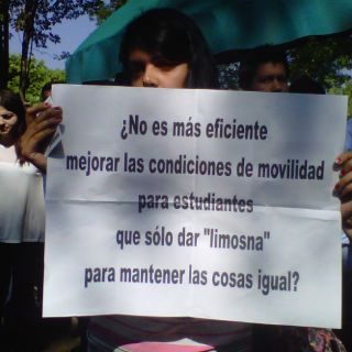 "¿No es más eficiente mejorar las condiciones de movilidad para estudiantes que solo dar 'limosna' para mantener las cosas igual?", se leía en el letrero que Fabiola sostuvo durante el discurso del gobernador Aristóteles Sandoval, atrás de las sillas dispuestas para los presentes.