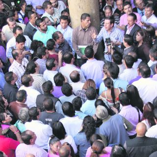 GUADALAJARA, JALISCO (06/DIC/2012).- Tras una asamblea con la dirigente del Sindicato de Trabajadores del Poder Legislativo, Irene Trejo Acosta, donde se acordó que desde esta mañana irían a paro, trabajadores del Congreso local inconformes por la falta de pago de las quincenas de noviembre encararon al líder de los diputados de Movimiento Ciudadano, Clemente Castañeda.