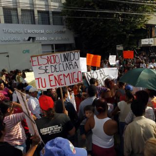 GUADALAJARA, JALISCO (11/JUL/2012).- Alrededor de 300 vecinos de El Salto llegaron esta tarde a la puerta del Tribunal Electoral del Poder Judicial del Estado de Jalisco (TEPJE), para manifestarse en contra del Partido Revolucionario Institucional (PRI) y el alcalde electo, Joel González Díaz.