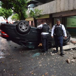 GUADALAJARA, JALISCO (18/JUL/2014).- Un vehículo cayó de un tercer piso de un estacionamiento en el Centro de Guadalajara la tarde de este viernes. El conductor salió ileso pese a que el vehículo quedó con las llantas hacia arriba y la cabina hacia el suelo.