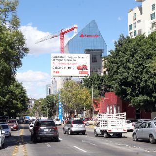 Alrededor del espectacular hay distintos comercios y postes inservibles sobre Américas que obstruyen el paso de los transeúntes, porque una parte de la avenida sirve de estacionamiento. El andador no cuenta con una rampa o un acceso para gente discapacitada y en una esquina se sitúa el espectacular entre cables y las ramas de un árbol que se enredan en la enorme estructura.