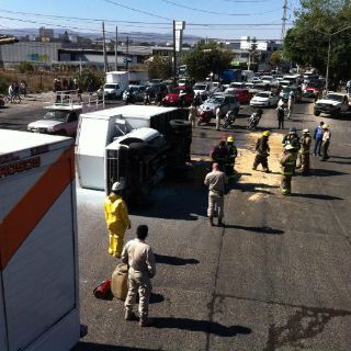 Bomberos tapatíos, junto con Protección Civil, lograron voltear el vehículo accidentado; además neutralizaron el químico derramado y procedieron con el saneamiento del asfalto del lugar.