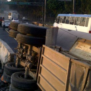 este viernes, la góndola o el doble semi remolque que era jalado por un tractocamión se desprendió del mismo y volcó, provocando grandes daños materiales en el muro de contención.