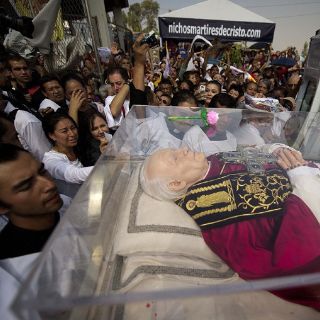 TEPIC, NAYARIT (31/OCT/2011).- Seis vendedores de artículos religiosos que acompañaban al convoy con las reliquias de Juan Pablo II, murieron calcinados el mediodía de ayer domingo al incendiarse el vehículo en que viajaban tras desbarrancarse por una falla en los frenos.