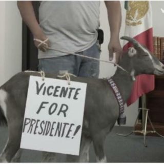 Pero no todo en el video de Fox es un discurso político. También presenta a una colaboradora: una cabra que porta un letrero con la leyenda "Vicente for Presidente" por un lado y "Un camión de tacos en cada esquina del otro".