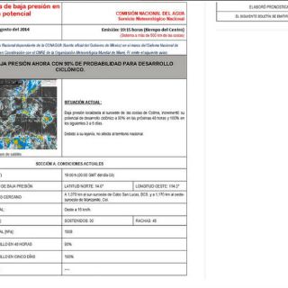CIUDAD DE MÉXICO (03/AGO/2014).- La baja presión que se ubica aproximadamente a mil 70 kilómetros al sur-suroeste de Cabo San Lucas, Baja California Sur tiene 90 por ciento de evolucionar a ciclón tropical en las próximas 48 horas.