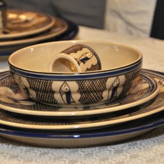 La vajilla de alta temperatura fue pintada en azul sobre un fondo perla y el diseño representa vivencias infantiles del artesano.