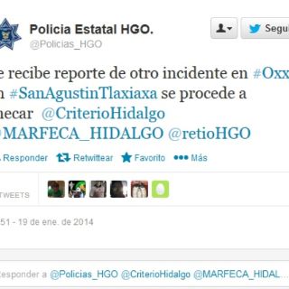 En la cuenta de Twitter @Policias_HGO se escribió la noche de este domingo: “Debido a los acontecimientos recientes optamos por reanudar nuestra labor informativa para salvaguardar la seguridad de #Hidalguenses”.