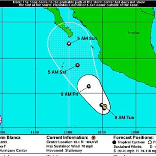 Los pronósticos de computadora de largo plazo del CNH ponen el cono de la trayectoria de 'Blanca' rumbo a la mexicana Península de Baja California para el domingo.