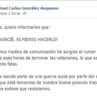 CHETUMAL, QUINTANA ROO (07/JUL/2013).- José Carlos González Anguiano, candidato del Partido del Trabajo a la presidencia municipal de Solidaridad, en Quintana Roo, desmintió haber renunciado este domingo al proceso electoral.
