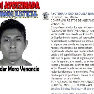 CIUDAD DE MÉXICO (06/DIC/2014).- Felipe de la Cruz, vocero de los padres de familia, explicó que se reunieron con los peritos argentinos donde les confirmaron que las muestras de ADN coinciden con las Alexander Mora y explicó que el pasado viernes los familiares se reunieron con los peritos en la escuela Normal de Ayotzinapa, donde les confirmaron que las muestras de ADN coinciden con las del estudiante.