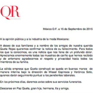En un comunicado de la firma QR Modelos, se informa que “a deseo de sus familiares y a nombre de los amigos de nuestra querida Queta Rojas queremos confirmar la noticia de su fallecimiento”.