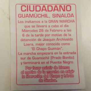 GUAMÚCHIL, SINALOA (26/FEB/2014).- En Guamúchil las calles amanecieron tapizadas de volantes donde invitan a los ciudadanos a unirse a una marcha para exigir la liberación de Joaquín “