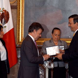 CIUDAD DE MÉXICO (02/AGO/2011).- El jefe de gobierno del Distrito Federal, Marcelo Ebrard, entregó las ''Llaves de la ciudad'' y nombró ''Huésped Distinguido'' a Juan Manuel Santos, presidente de Colombia.