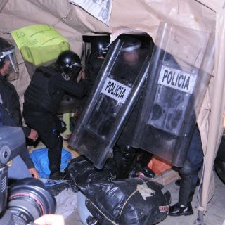 Elementos del Agrupamiento Granaderos de la Secretaría de Seguridad Pública del Distrito Federal quitaron de la Plaza de la República a los maestros que desde septiembre estaban ahí instalados y personal de limpieza ha comenzado a quitar plásticos, basura y otros materiales dejados por los manifestantes desalojados.
