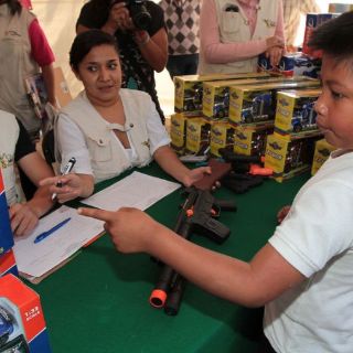 Programa ''Por tu Familia, Desarme Voluntario'', en la delegación Tlalpan, donde los niños intercambiaron armas de plástico por juguetes didácticos.