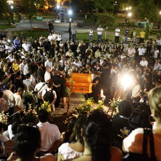 SANTIAGO, NUEVO LEÓN (20/AGO/2010).- Los restos del alcalde de Santiago, Edelmiro Cavazos Leal, son velados desde esta madrugada en compañía de los habitantes de este municipio. Los santiaguenses realizaron actos fúnebres, cantos religiosos y plegarias en la plaza central.
