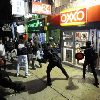 Sin embargo, al término del mitin en el Ángel, un grupo de personas encapuchadas provocó daños en siete sucursales bancarias y cuatro establecimientos mercantiles.