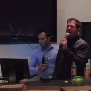 El evento se realiza en presencia de varias personas a manera de convivio. En una mesa central hay restos de bebidas y comida, como pizza.