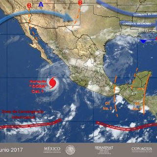 CIUDAD DE MÉXICO (27/JUN/2017).- El huracán "Dora", que se mantiene en categoría uno de la escala Saffir-Simpson, comienza a debilitarse en el Pacífico mientras avanza hacia el oeste-noroeste, alejándose de las costas mexicanas, informó este martes el Servicio Meteorológico Nacional (SMN).