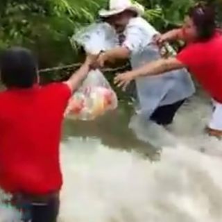 CIUDAD VICTORIA, TAMAULIPAS (25/SEP/2014).- Para llevar apoyos a las familias damnificadas de un ejido incomunicado, con ayuda de una soga y personal del Ayuntamiento, el alcalde de Llera, José Pablo Valadez Hernández, se metió a la corriente de un arroyo crecido y apoyó a la repartición de despensas y cobertores.