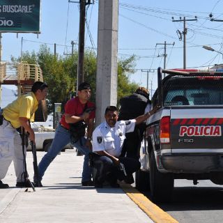 ESCUDOS HUMANOS.- Policías estatales se resguardan tras sus vehículos durante el enfrentamiento que sostuvieron con un miembro de una empresa de seguridad privada que, con armas de alto poder, tomó como rehenes a una mujer y a un agente estatal en Saltillo.