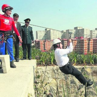 Mientras los niños invitados de la Secundaria Técnica Número 8 miraban con nostalgia desde las pantallas, el Primer Mandatario aprovechó para quitarse el saco y tirarse de las dos nuevas tirolesas del predio, de 100 y 150 metros. Antes de emprender el vuelo, el Mandatario bromeó “va a estar fuerte el trancazo”.