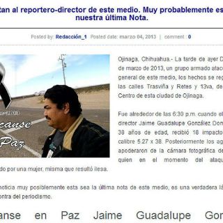 El domingo por la tarde, un sujeto no identificado le disparó a Jaime González Domínguez, editor del sitio de internet OjinagaNoticias, mientras comía en un puesto de tacos en la ciudad de Ojinaga, según la Procuraduría General de Chihuahua.